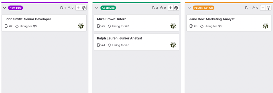 - Issues can track candidate screening, interviews, and onboarding tasks.